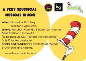 Get ready for a wonderfully wacky night of Musical Bingo, inspired by our musical production of Seussical Jr! Join us for a Seuss-tacular fundraiser filled with music, rhymes, and plenty of laughter. Instead of numbers, listen out for your favourite tunes and themes from the 90’s, 00’s and hits of today as you mark off your bingo card and sing along the way. Dress up as your favourite Seuss character, enjoy some fundraising games, and get ready for a night of playful fun and friendly competition. Every ticket and tune helps us raise valuable funds—so gather your friends, warm up those singing voices, and let’s make it a Seussical night to remember!