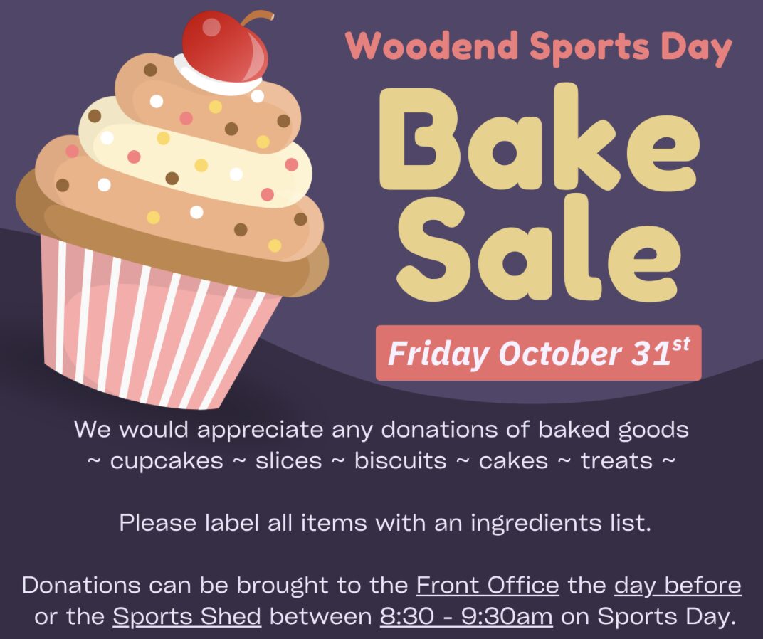 We have our annual Baked Goods stall on Sports Day! The proceeds go to support Sport at Woodend and so we would appreciate you supporting us by providing some baked goods and/or offering some time to work on the stall. Please see below the details. If you would like further information, please contact Ebony at the front office. Thank you for supporting Sport at Woodend.