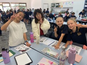 The Welcome Assembly, held on Monday 23rd, was a great way to start their time here at Woodend. Celebrating Harmony Day as well, it was a super exciting start to tour visitors school life at Woodend. Myojo students were able to join the Yr 5/6 and Yr 6 classes on an excursion to the Central Market, visited a junior primary class, joined in a Technology lesson as well as being part of a class and experiencing day to day events. Students in our host classes were able to have a lesson taught to them by the Myojo students in their class with classes enjoying a Japan Quiz or fukuwarai game (a similar game to pin the tail on the donkey but with more parts to pin on!) or writing their names in Japanese using special ink pens. The students’ time at Woodend was jam packed!
