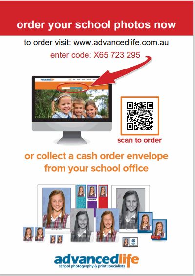 SCHOOL PHOTOGRAPHS WILL BE TAKEN ON: Tuesday, 22 July 2025 or Friday, 25 July 2025 ORDER NOW go to www.advancedlife.com.au and enter the code X65 723 295 Due to our large numbers, photos will be taken over 2 days. Teachers will have a list at the end of the week...