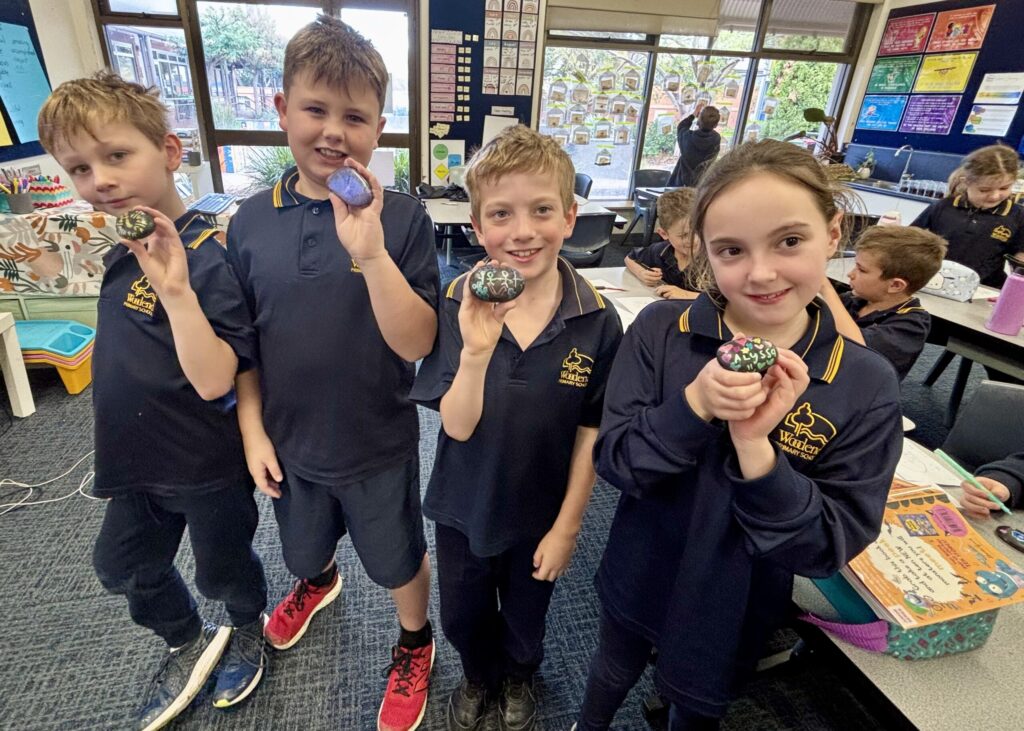 In Room 25, Year 3 students explored artworks inspired by The Seven Sisters, discussing the symbols used in the Dreaming story and their meanings. They designed their own symbols to represent the values of Reconciliation Week, painting them onto pebbles as gifts for our school garden – handed to Dylan to caretake in the garden. Meanwhile, Room 30 students read Collecting Colour by Kylie Dunstan, learning about weaving practices. They created their own vibrant woven artworks using paper, exploring the connection between nature, culture, and creativity.