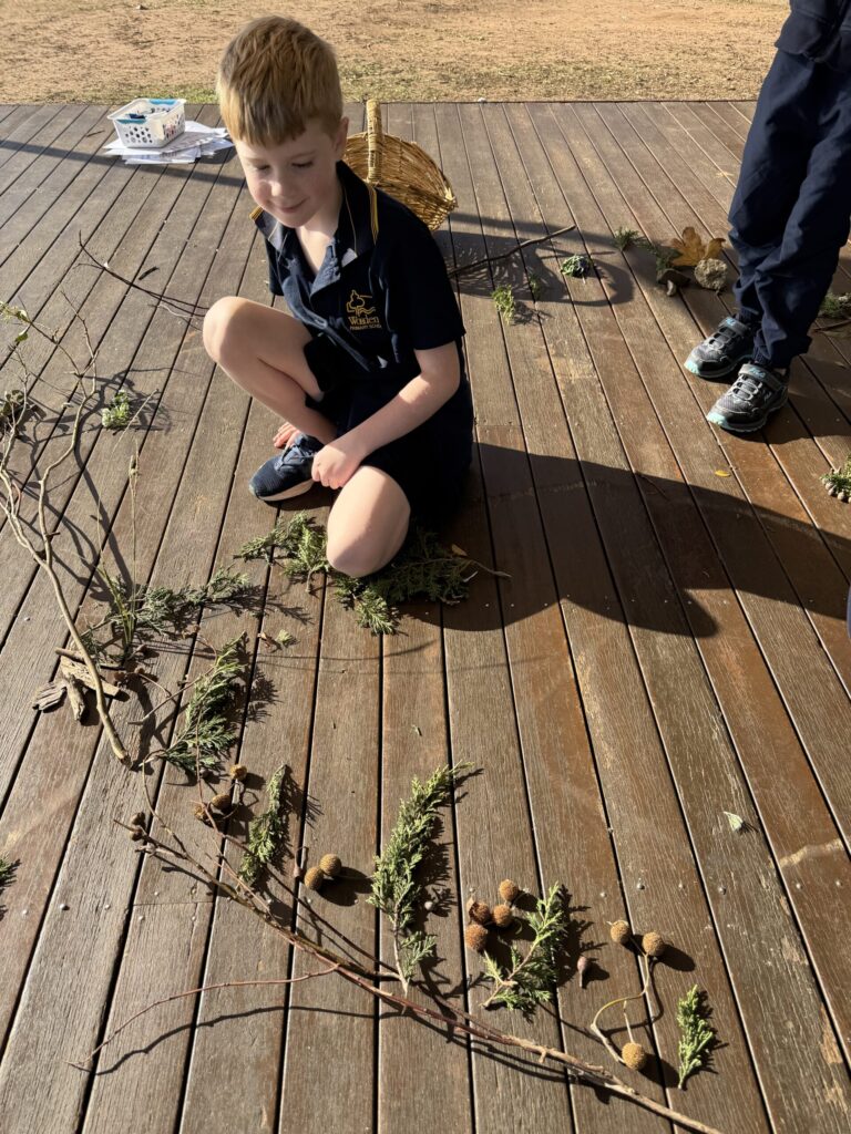 Year 1 students in Rooms 18, 20, and 21 engaged in nature-based learning, including scavenger hunts, mandala-making, and sand drawings using Aboriginal symbols. They worked with natural materials to connect with special places in their environment. Room 19, together with their Reception and Year 1 buddies, read The Rainbow Serpent and helped create a collaborative school artwork, celebrating connection to Country and the resourcefulness of First Nations cultures.