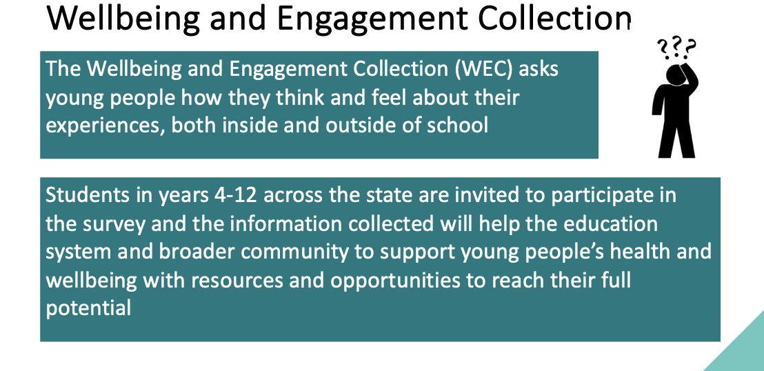More information on the Wellbeing and Engagement Collection can be found at www.education.sa.gov.au (search: wec) or can be collected from the school. For questions or concerns, or to view the questions, please email Education.WECSA@sa.gov.au